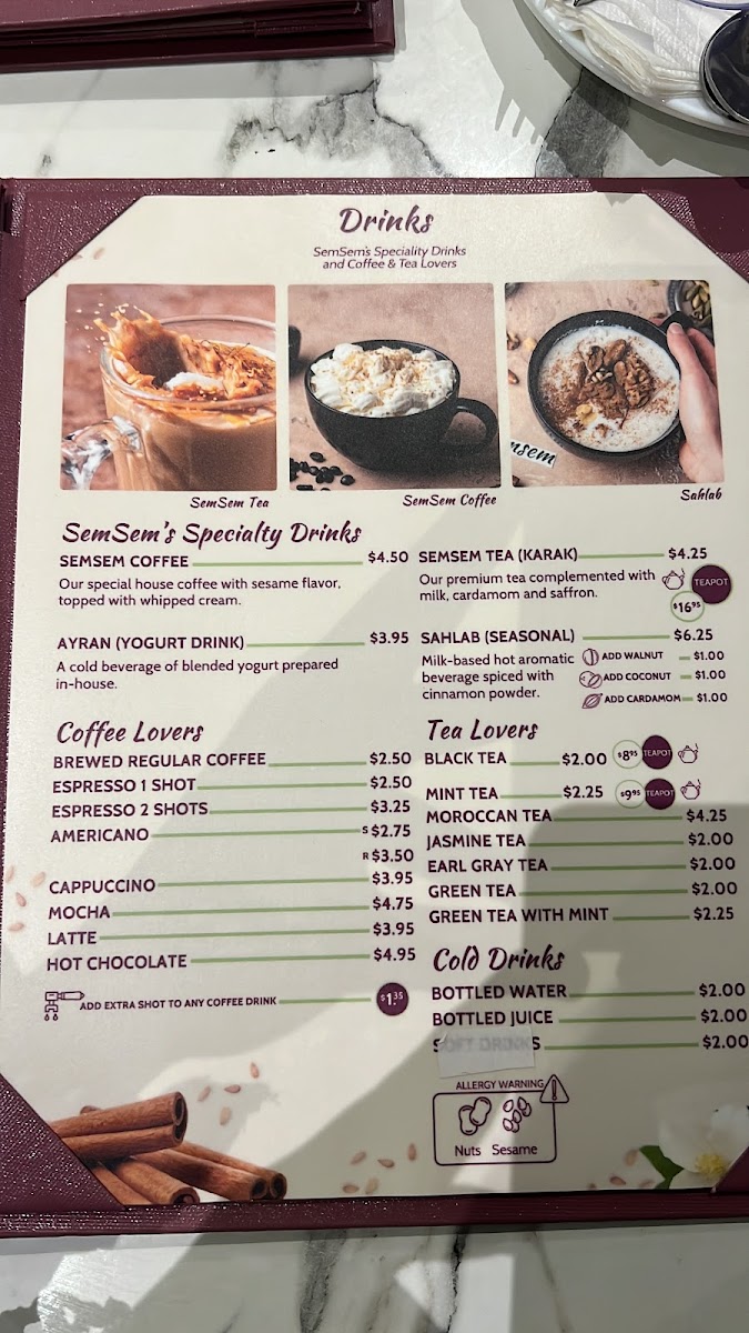 - Desserts: Don’t miss the Mirage, a cultural gem that adds a unique SemSem twist to the classic Namoura, priced at just CA$3.75.